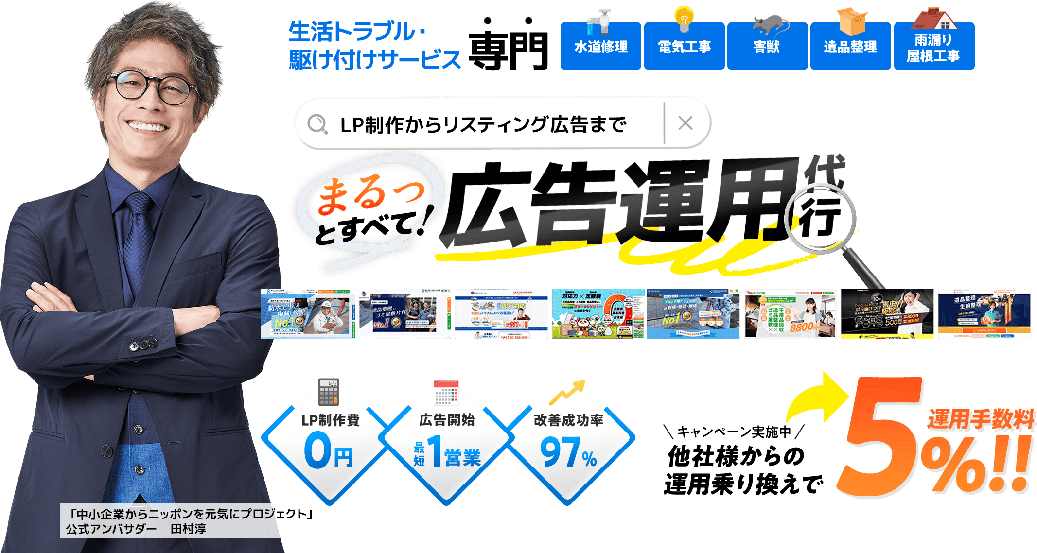 水道修理、不用品回収、害虫駆除、鍵修理など、駆けつけサービスに特化しているからこそ「売れる広告」「売れるLP」を熟知しております